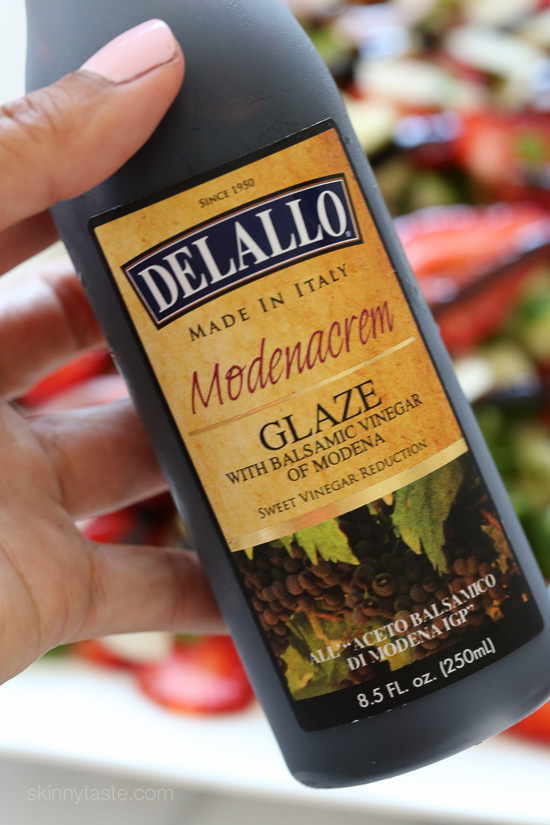 I’m love using balsamic glaze over salads, it’s not just pretty it’s sweet and tangy and there’s no need for oil. Delallo makes the best one I’ve tried, but I’ve also seen the glaze at Trader Joes. If you don’t have it, you can certainly drizzle the salad with regular balsamic, although it won’t be as pretty.